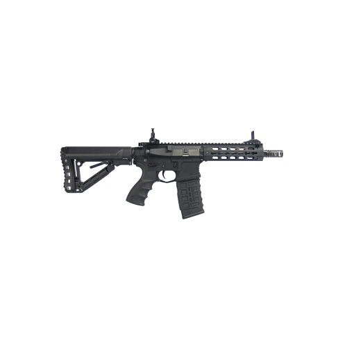 The G&G GC16 Warthog 7'' AEG Black is an Airsoft 6mm BB Gun, based on the M4, and is a continuation of the G&G Combat Machine series. The weapon is constructed almost entirely from Alloy, featuring an alloy Receiver, Stock Tube, Hand Guard and Barrel, with a Polymer Pistol Grip, Magazine and Stock. The weapon has a high attention to detail, giving the user a multitude of features only seen on Expensive High-End Guns, such as the Ambidextrous Fire Select, Magazine Release, as well as an in-built MOSFET Unit, Electronic Trigger and Fuse System. The MOSFET protects the gun from damage, as well as includes a three round burst mode which replaces the full-auto function if needed. The top of the weapon features a full length 20mm RIS / RAS Rail Panel, allowing the attachment of a variety of Scopes and Sights. The hand-guard features a Key-Mod Rail system, allowing you to attach a variety of KeyMod Rail Attachments, such as Foregrips, Rail Panels and more. The magazine is unique to the G&G Range, featuring a Rubber Hand Molded Grip, giving extra hold and stability on the magazine. The stock of the weapon is multi-position adjustable, featuring a rubber butt stock for extra grip, as well as a textured cheek rest. This gun is perfect for new and old Skirmishers alike, giving you a range of features which are usually seen only in high-end weapons, but at a great price.