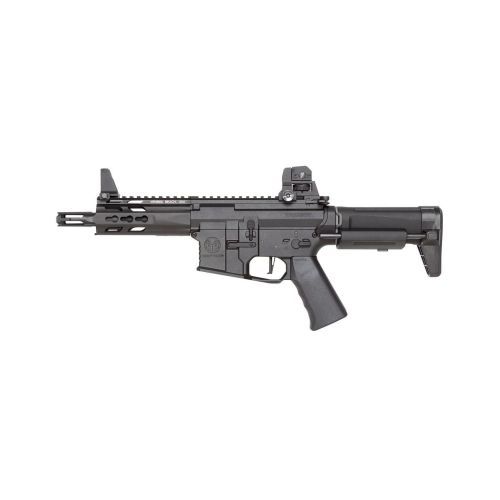 The Krytac Trident Mk2 PDW AEG is the most compact rifle in the series and is designed for maximum manoeuvrability and control, in close quarters combat. The full metal AEG features a short 5.5” barrel and a 5” free floating, TR105, keymod hand guard. The hand guard features three prongs at the front that can be used to brace the gun against barricades, eliminating the need for an aftermarket barricade stop rail accessory. The MK2 aluminium receivers feature a modern design style with a stamped KRYTAC logo and include an integrated trigger guard. An originally designed pistol grip enhances the rifle’s comfort. Additional features include an ambidextrous fire selector and a locking bolt that provides easy access to the KRYTAC rotary hop-up system. The KRYTAC rotary hop-up has 15 adjustment settings and a numbered adjustment wheel for a quick reference point to determine how much hop is needed. The futuristic KRYTAC sliding stock is adjustable to two positions and is supported by the enhanced KRYTAC buffer tube to allow space for a wider range of batteries. The PDW utilizes AR/M4 style magazines and sports similar controls for those familiar with the platform. In addition to looking futuristic and functional, the PDW is also a fantastic performer thanks to its gearbox.