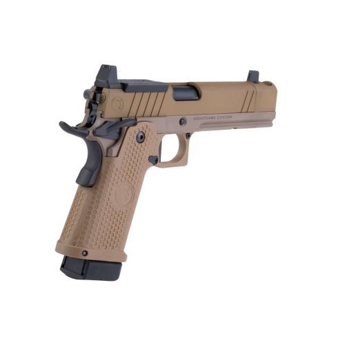 The Nighthawk Custom Sand Hawk represents the pinnacle of precision and performance in the Nighthawk Customs line-up. This real-steel double-stacked 1911 is expertly crafted to redefine excellence in firearms, seamlessly blending innovation with tradition through its billet slide and frame, along with a single-port compensator. RWA has embraced the challenge of creating an affordable yet high-quality Airsoft replica of this impressive firearm.